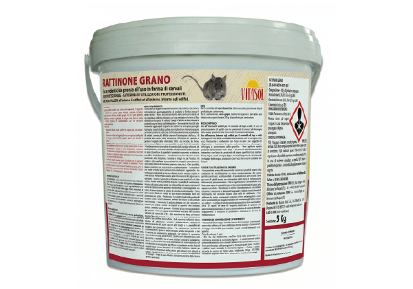 Rattinone Grano si presenta sotto forma di esca in cereali pronta all’uso, progettata per essere impiegata esclusivamente all’interno di appositi contenitori per esche. La composizione prevede Bromadiolone allo 0,005%, Denatonium benzoate allo 0,001% e coformulanti e appetizzanti fino a completamento del prodotto. È indicato per il controllo di topolino domestico, ratto grigio e ratto nero. Il prodotto è disponibile in buste da 1,5 kg (12 pezzi per confezione) oppure in secchio da 5 kg, rispondendo alle diverse esigenze operative.