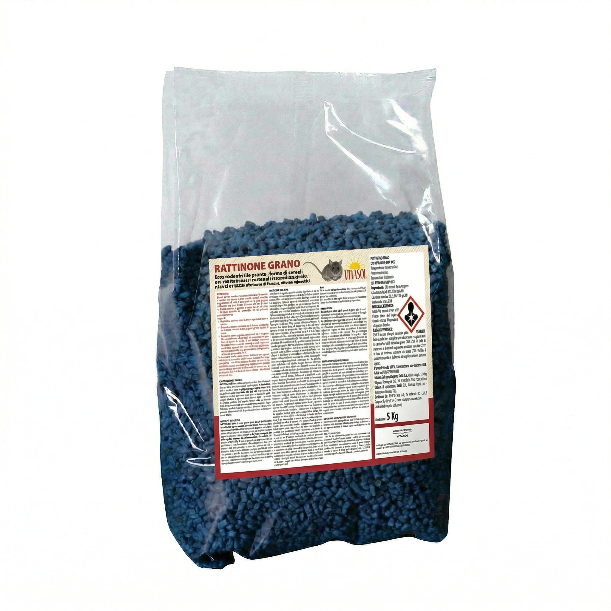 Rattinone Grano si presenta sotto forma di esca in cereali pronta all’uso, progettata per essere impiegata esclusivamente all’interno di appositi contenitori per esche. La composizione prevede Bromadiolone allo 0,005%, Denatonium benzoate allo 0,001% e coformulanti e appetizzanti fino a completamento del prodotto. È indicato per il controllo di topolino domestico, ratto grigio e ratto nero. Il prodotto è disponibile in buste da 1,5 kg (12 pezzi per confezione) oppure in secchio da 5 kg, rispondendo alle diverse esigenze operative.