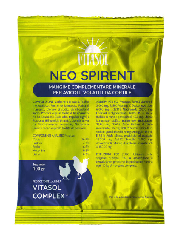 Neo Spirent è un mangime complementare studiato per il benessere dell’apparato respiratorio di polli e conigli. Grazie alla sinergia tra estratti vegetali di Pompelmo (Citrus x paradisi), Salice Bianco (Salix alba), Propoli e Vitamina C, svolge un’efficace azione antibatterica, antinfiammatoria e antiossidante. Ideale per supportare gli animali durante i colpi di freddo o stress ambientali, favorisce la salute delle prime vie respiratorie senza alcuna restrizione per il consumo dei prodotti derivati (carne e uova).